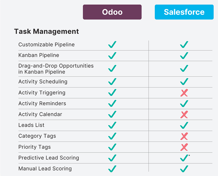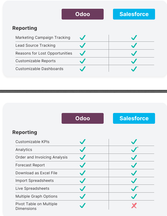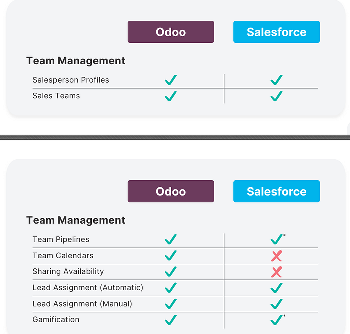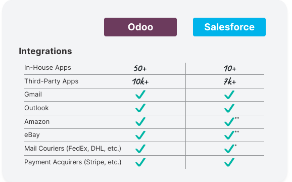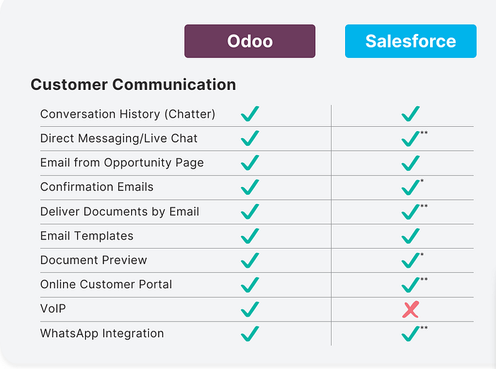 Both Salesforce and Odoo offer comprehensive CRM capabilities, including cloud storage, customer and team management, and sales automation. However, Salesforce often requires additional purchases for advanced features, while Odoo includes most functionalities in its standard package, promoting better integration across various business operations beyond just CRM.